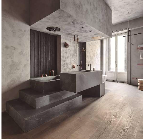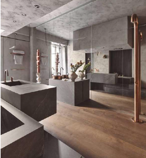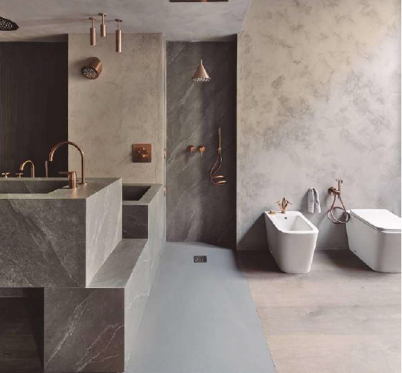 Entre los rasgos más distintivos del espacio, destaca el uso del acabado cobre cepillado en la grifería, los sistemas de ducha, la hidroterapia y los accesorios de baño. Esta elección aporta una calidez singular y un matiz decorativo de gran elegancia, capaz de convertir cada pieza en un elemento protagonista dentro del espacio. Su presencia enriquece la colección y acentúa su carácter arquitectónico y ornamental.